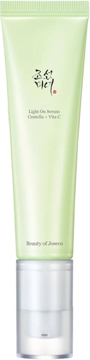 El Suero Light On Centella Vita C de Beauty Of Joseon es un sérum iluminador formulado para pieles sensibles. Contiene un 68% de extracto de Centella Asiática, que calma, hidrata y repara la piel. Incluye un 10% de ácido 3-O-Etil Ascorbico, un derivado estable de la vitamina C que mejora la absorción cutánea y minimiza la irritación, lo que permite una mejor compatibilidad con otros ingredientes. Este sérum vegano es apto para todo tipo de pieles y ofrece propiedades antioxidantes, así como luminosidad e hidratación. Su textura es ligera y refrescante, adecuada para uso diario y nocturno. Se sugiere aplicar una cantidad adecuada tras la limpieza y el tónico, masajeando suavemente hasta su completa absorción.