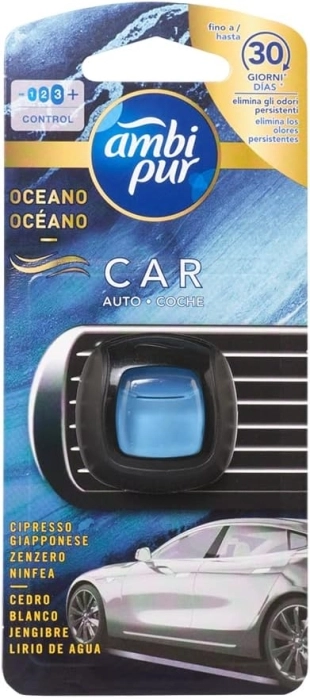 Ambi Pur Car Océano 2ml es un difusor de fragancia con clip diseñado para eliminar olores y proporcionar un aroma fresco en el coche aprovechando el flujo de aire de las rejillas de ventilación.
