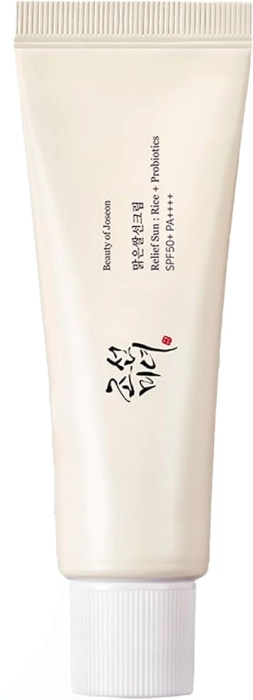 El Protector Solar Relief Sun Rice Probiotics SPF50 de Beauty of Joseon es un producto vegano que ofrece protección solar con un factor de protección solar de 50 PA. Su fórmula incluye un 30% de extracto de arroz y extractos fermentados de cereales, que aportan hidratación y nutrición a la piel. Presenta una textura de crema ligera que se absorbe fácilmente, dejando un acabado húmedo similar al de una crema hidratante, sin dejar rastro blanco. Los extractos fermentados son ricos en vitaminas B, C y E, así como en aminoácidos y minerales, contribuyendo a calmar y nutrir la piel seca. Además de la protección solar, ayuda a mantener la luminosidad y tiene propiedades reafirmantes. Se recomienda aplicar diariamente como último paso de la rutina de cuidado de la piel.