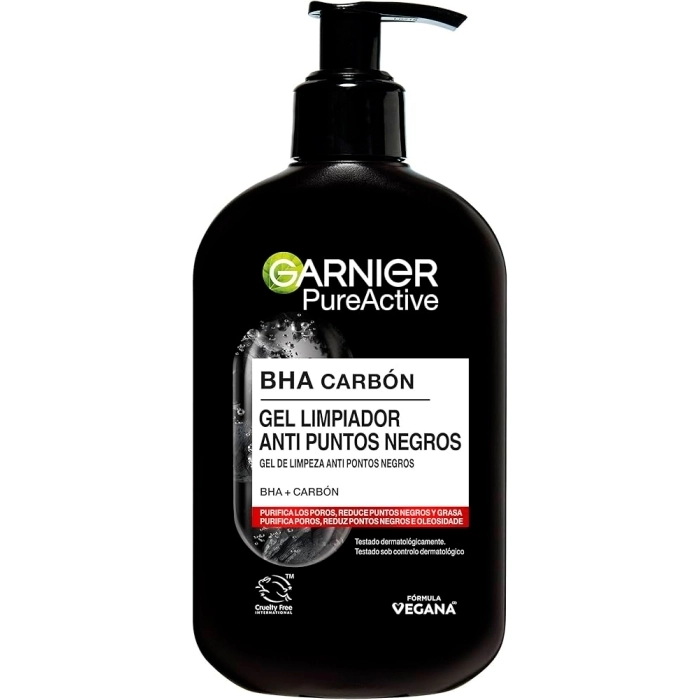 Garnier Pure Active Gel Limpiador Anti Puntos Negros enriquecido con BHA (Ácido Salicílico) y Carbón de origen natural, purifca la piel, reduce granitos y puntos negros y previene su reaparición para una piel limpia y matificada.