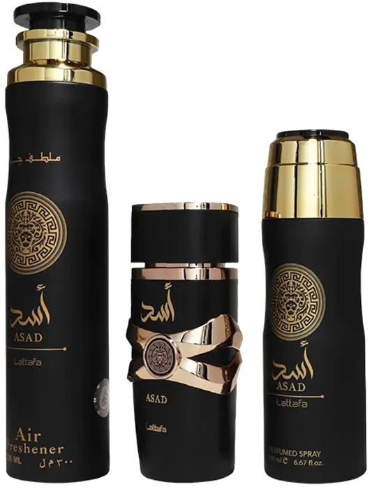 El Set Asad de Lattafa es una fragancia audaz y sofisticada que combina notas especiadas, amaderadas y dulces. Esta lujosa colección ofrece un aroma potente y duradero que evoluciona con el tiempo, lo que la convierte en la opción perfecta para quienes disfrutan de fragancias complejas y ricas.