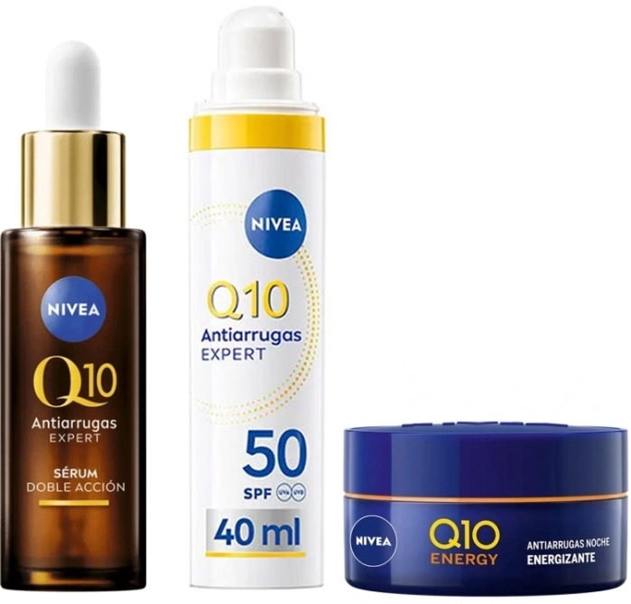 NIVEA Pack Q10 Rutina Completa Antiedad combina ciencia avanzada y cuidado intensivo para reducir arrugas, prevenir la aparición de nuevas líneas de expresión y proteger la piel frente a los daños del sol y la glicación. Con Q10 puro, Creatina, Ácido Hialurónico y GLYCOSTOP™, esta rutina completa ofrece una piel más firme, joven y saludable día y noche.