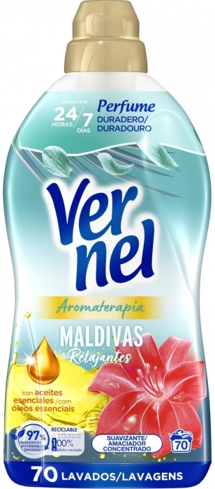 El suavizante de ropa Vernel Aromaterapia Maldivas Relajantes te proporciona sensaciones de vacaciones perfumadas gracias a su exclusiva tecnología de perfume sostenible y a sus aceites esenciales.